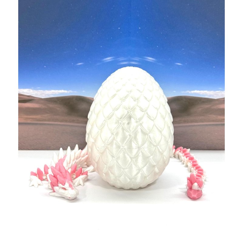 3D Printed enchanting Articulated Gemstone Dragon - a mystical creature that brings a touch of fantasy to your world. Unveil the mystery of the Satin Scaled Dragon Egg and this White and Pink Gemstone Dragon ( measures 12.5" long) a captivating fusion of elegance and fantasy. Encased within a meticulously designed crystal egg, this dragon reveals itself with a symphony of colors - a testament to its magical heritage. ------- Small Components Advisory: ------- Please note that this product may contain small components and might not be suitable for very young children. Given the characteristics of 3D printing, there is a potential for small components to detach if handled aggressively or dropped. Therefore, we advise against allowing younger children to interact with the dragon. Please consider that 3D printed objects might include minor imperfections such as layer lines. These are a natural and inherent aspect of the printing process. We strive to produce the highest quality items, and these imperfections contribute to the unique character of each piece. Recall the unique creation of each dragon, crafted exclusively for you. The color selections available are depicted in the provided photos. Please be aware that variations in color may occur due to discrepancies in filament production and the characteristics of the monitor or screen you are utilizing to view the listing. Additionally, the arrangement of prints using multi-colored filament rolls can influence color distribution. ------- Licensing Information: ------- Authorized Design: NOHo3D holds the official authorization for the production of this exquisite design created by CinderWing3D.