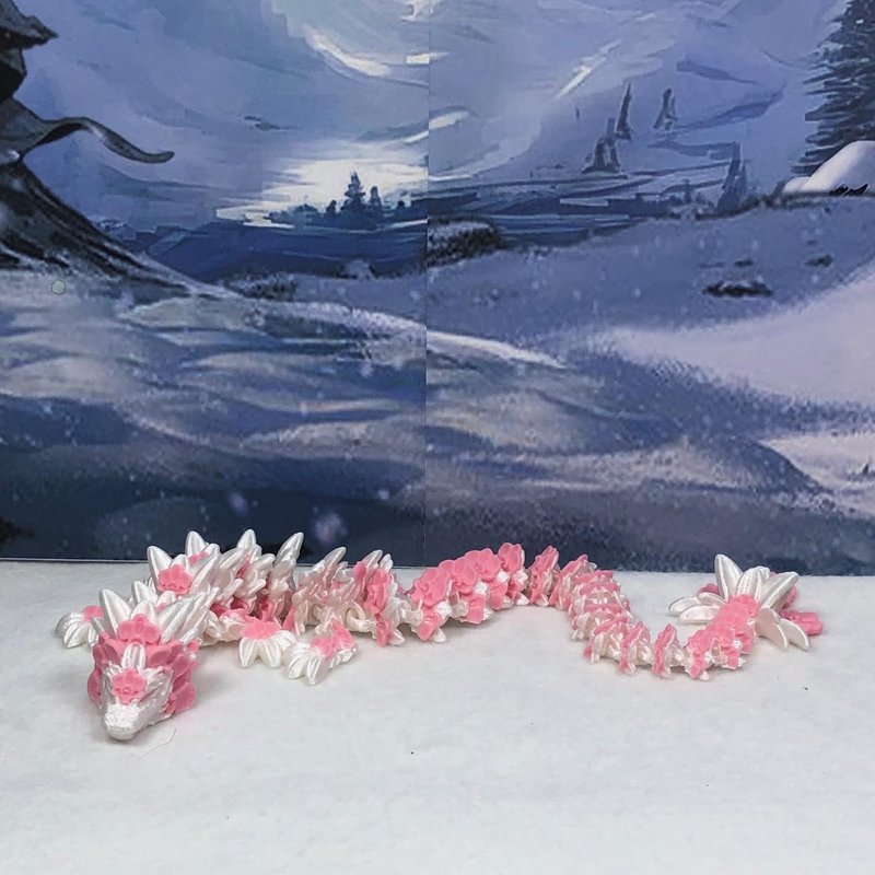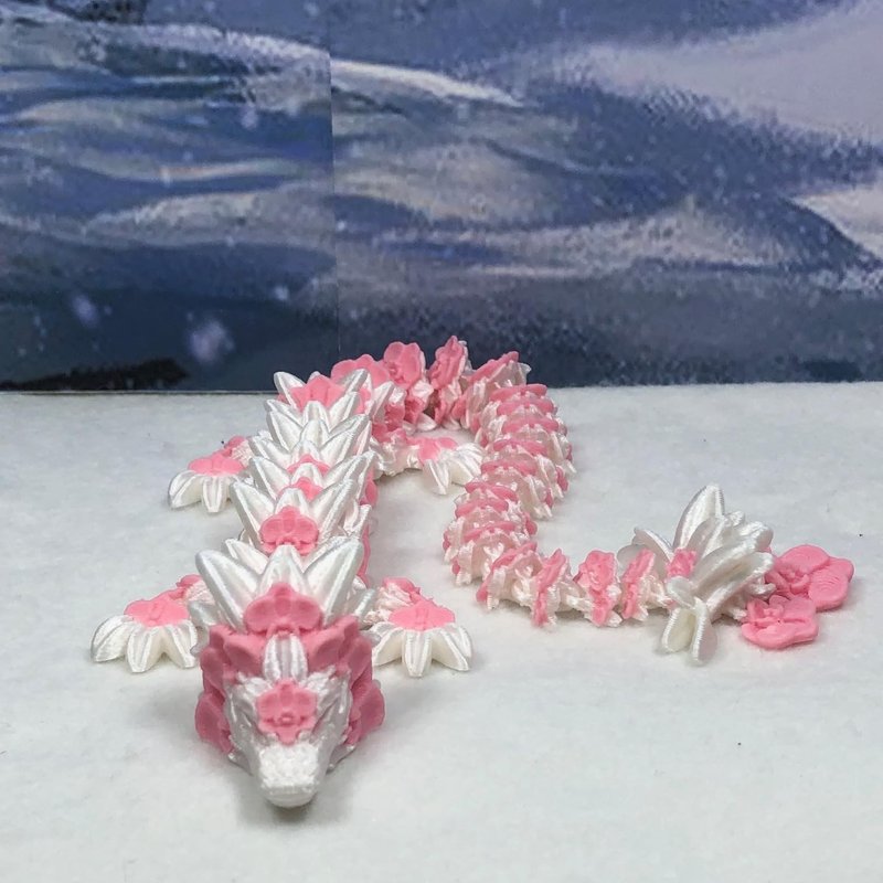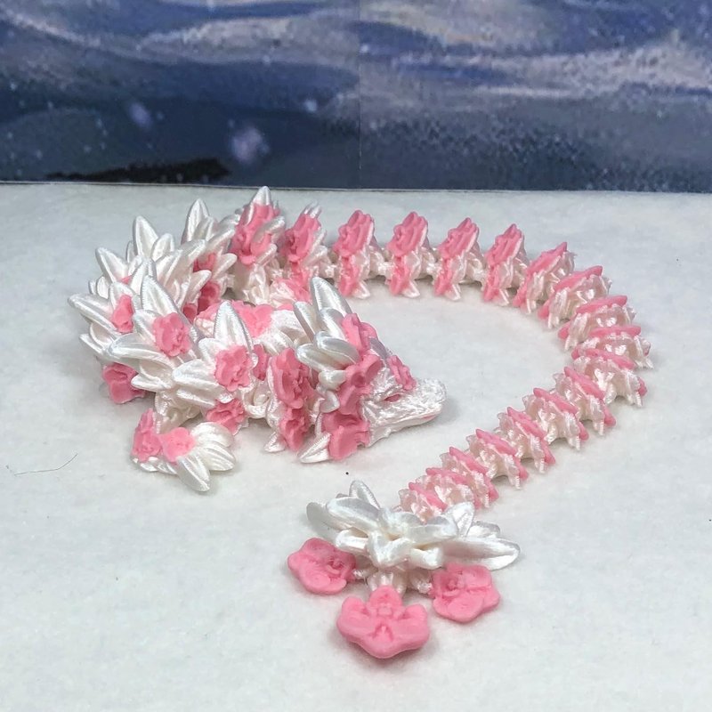 3D Printed enchanting Articulated Orchid Dragon - a mystical creature that brings a touch of fantasy to your world. Unveil the mystery of this White and Pink Orchid Dragon ( measures 12" long) a captivating fusion of elegance and fantasy. Encased within a meticulously designed egg, this dragon reveals itself with a symphony of colors - a testament to its magical heritage. ------- Small Components Advisory: ------- Please note that this product may contain small components and might not be suitable for very young children. Given the characteristics of 3D printing, there is a potential for small components to detach if handled aggressively or dropped. Therefore, we advise against allowing younger children to interact with the dragon. Please consider that 3D printed objects might include minor imperfections such as layer lines. These are a natural and inherent aspect of the printing process. We strive to produce the highest quality items, and these imperfections contribute to the unique character of each piece. Recall the unique creation of each dragon, crafted exclusively for you. The color selections available are depicted in the provided photos. Please be aware that variations in color may occur due to discrepancies in filament production and the characteristics of the monitor or screen you are utilizing to view the listing. Additionally, the arrangement of prints using multi-colored filament rolls can influence color distribution. ------- Licensing Information: ------- Authorized Design: NOHo3D holds the official authorization for the production of this exquisite design created by CinderWing3D.