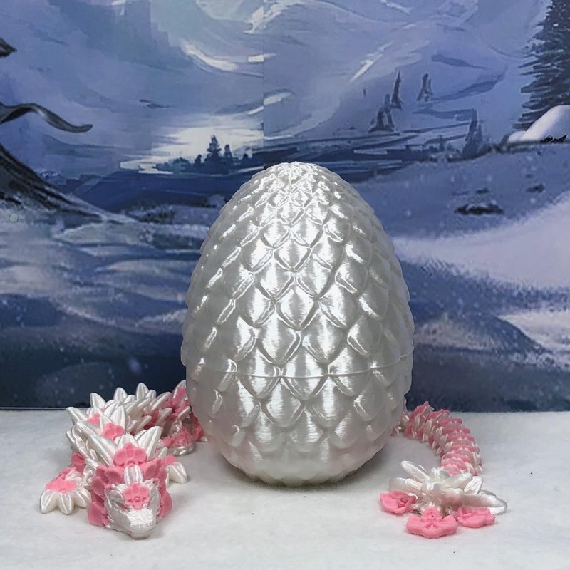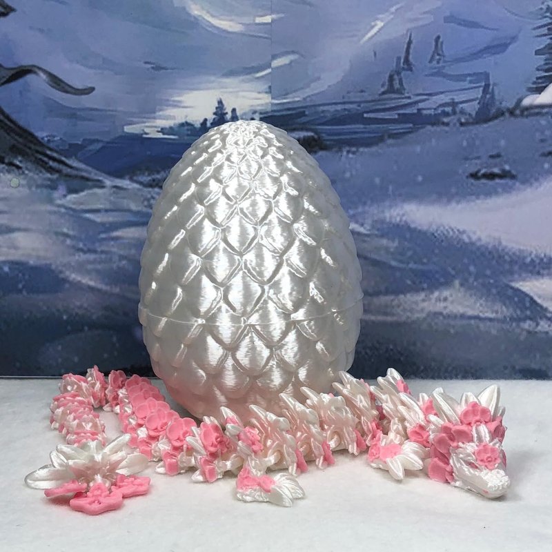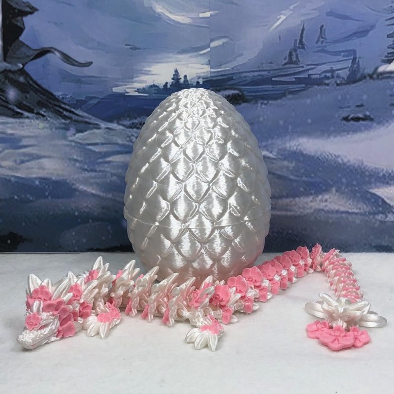 3D Printed enchanting Articulated Orchid Dragon - a mystical creature that brings a touch of fantasy to your world. Unveil the mystery of the Scaled silky White Dragon Egg and this White and Pink Orchid Dragon ( measures 12" long) a captivating fusion of elegance and fantasy. Encased within a meticulously designed egg, this dragon reveals itself with a symphony of colors - a testament to its magical heritage. ------- Small Components Advisory: ------- Please note that this product may contain small components and might not be suitable for very young children. Given the characteristics of 3D printing, there is a potential for small components to detach if handled aggressively or dropped. Therefore, we advise against allowing younger children to interact with the dragon. Please consider that 3D printed objects might include minor imperfections such as layer lines. These are a natural and inherent aspect of the printing process. We strive to produce the highest quality items, and these imperfections contribute to the unique character of each piece. Recall the unique creation of each dragon, crafted exclusively for you. The color selections available are depicted in the provided photos. Please be aware that variations in color may occur due to discrepancies in filament production and the characteristics of the monitor or screen you are utilizing to view the listing. Additionally, the arrangement of prints using multi-colored filament rolls can influence color distribution. ------- Licensing Information: ------- Authorized Design: NOHo3D holds the official authorization for the production of this exquisite design created by CinderWing3D.