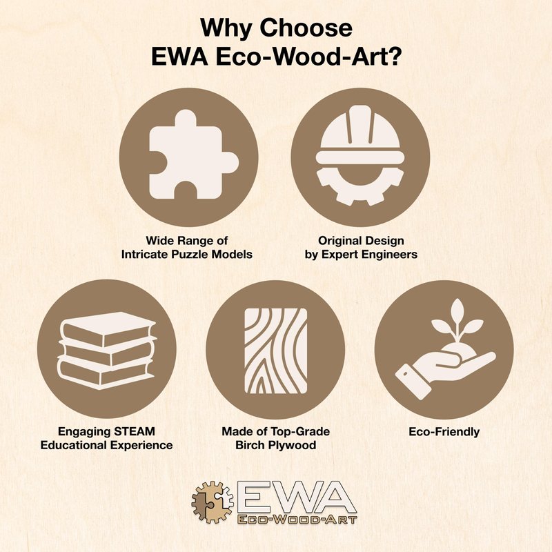 - Craft Your Way with Eco Wood Art: From mechanical kits to classic and interior puzzles, we offer over 50 original EWA models in various complexities, created by our excellent team of engineers through high-precision laser equipment.