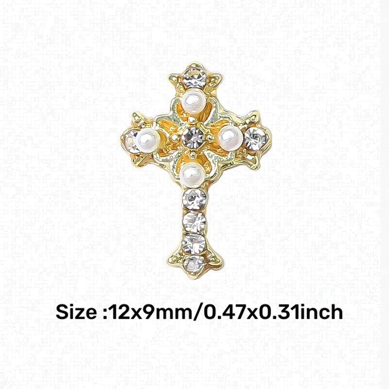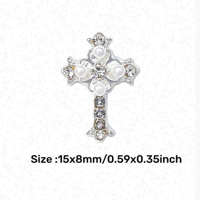 - šćExcellent Craftsmanshipć3D nail charms made of high-quality metal, artificial pearl Mosaic. Reliable quality, beautiful surface, not easy to fracture deformation, not easy to hurt the nail, lightweight, comfortable wear makes you more elegant and charming. each cross charm is approximately 12x8mm/0.47x0.31inch.