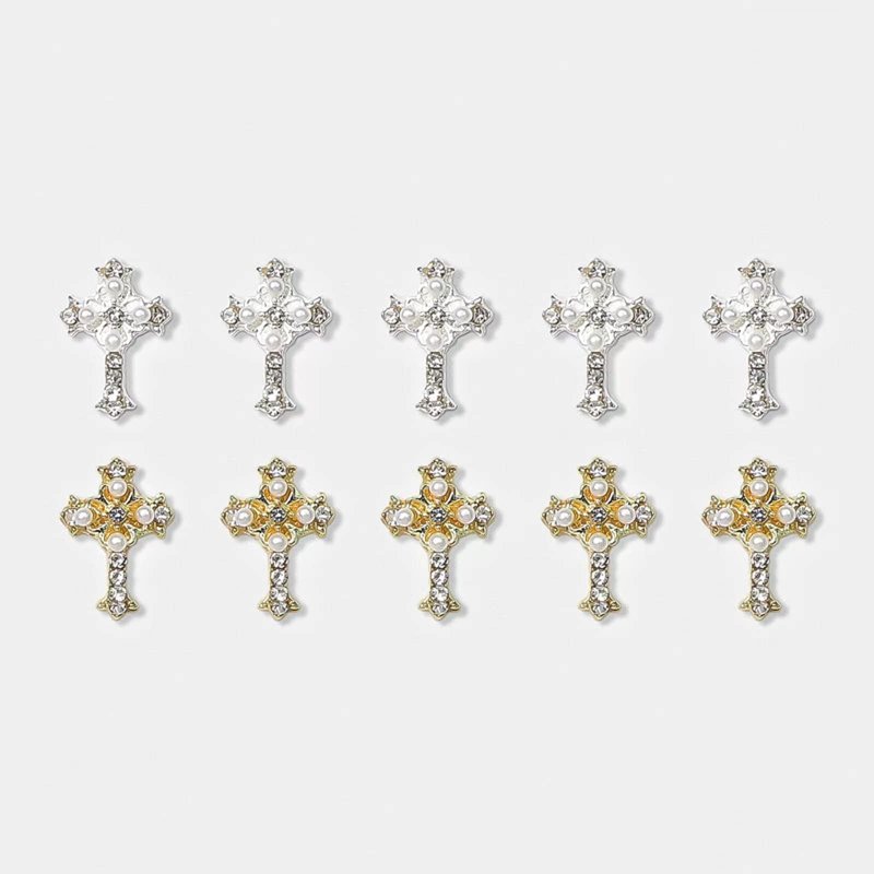 - šćRetro Pearl Cross Nail CharmćYou will get 20pcs of 3D retro pearl cross nail charm in 2 colors, 10pcs of each color. Nail charms in gold and silver can make your nails look elegant and special. These nail charm stones pair perfectly with other nail design items, so show your imagination.