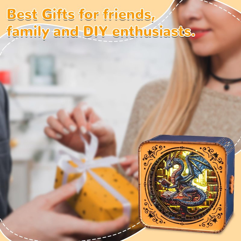 3D Wooden Puzzle Night Light, Library Dragon DIY Puzzles for Adults, Eye Care Night Light with Touchable Switch, Personalized Gifts for Family Friend DIY Puzzle Lover