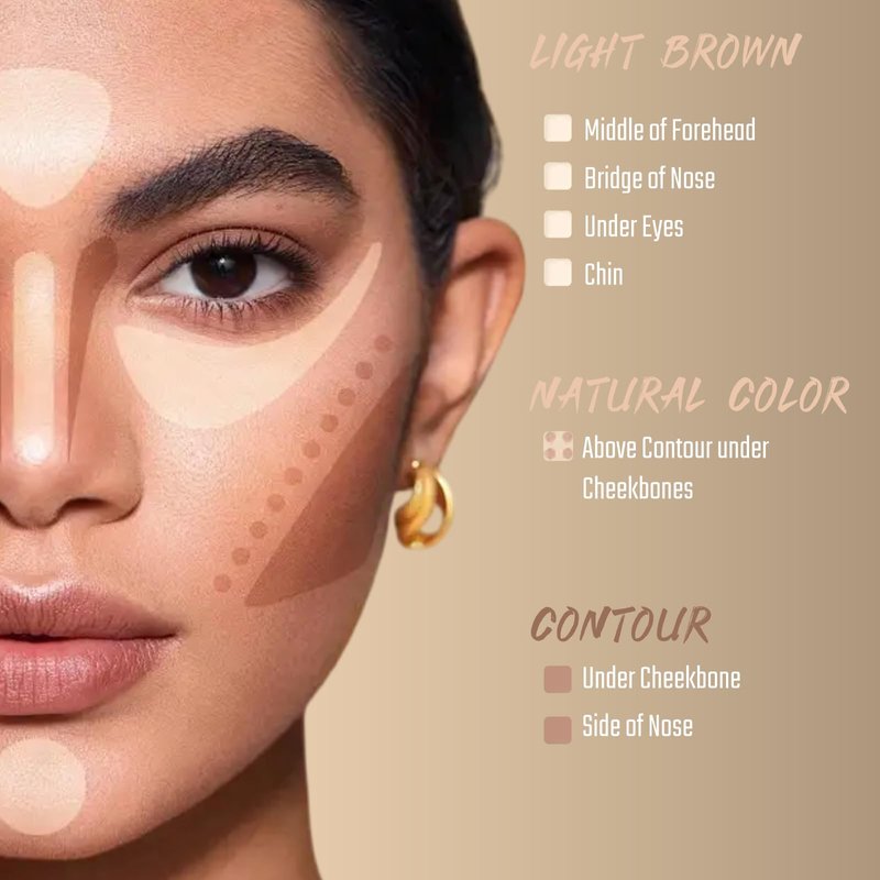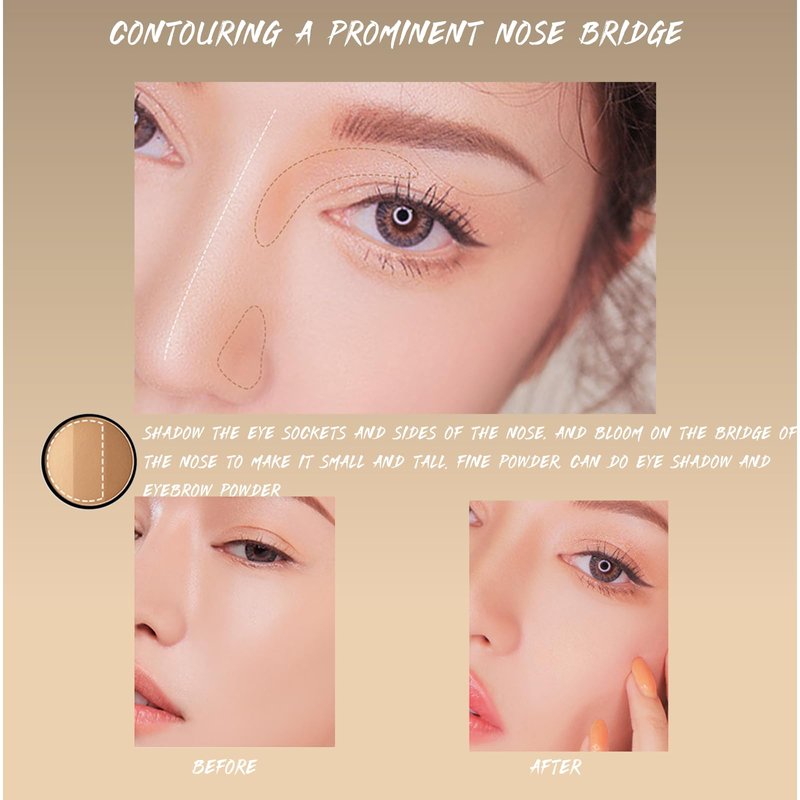 - HOW TO USE 1. Hairline: from the temple to the chin contour, making the face look slimmer. 2. Jawline: Draw contours along the mandibular and mandibular lines to shape the jawline. 3. Zygoma: Contour from temple to mouth to create clear cheekbones. 4. Both sides of the nose: From the front of the eyebrows downward to the base of the nose, create a longer, taller nose. 5. Eyelids: Swipe across the eyelid contour to make eyes appear deeper.