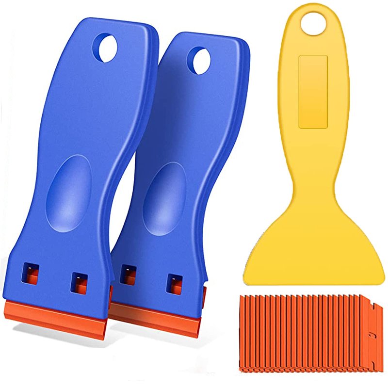 Razor blade Scrapers kit set: 2 mini plastic scraper(blue),1 plastic putty knife(yellow).10pcs double edged plastic blades no scratch during use,