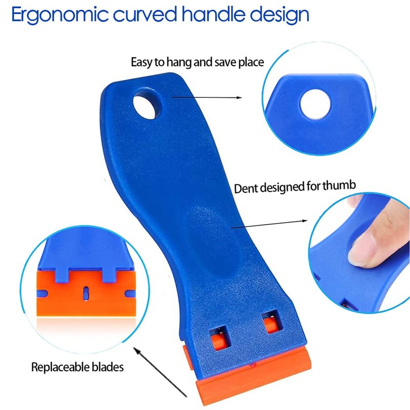- Comfortable Cleaning Scrapper Tools,With an ergonomic curved handle design and a dent on the handle designed specially for the thumb to be placed on it while working,Our plastic scraper provid comfortable control and save your time and energy.A good plastic razor scraper tool to save your nails removing sticker or lable.