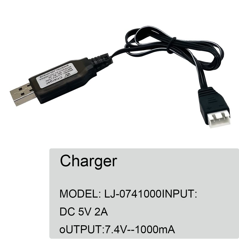 - The lipo battery charger is specially used for charging 7.4V lithium polymer battery, input: DC 5V, output current: 1000mA, We recommend that you use it at a voltage of 7.4V below 2000mAh. it is not recommended to use batteries below 500mah.