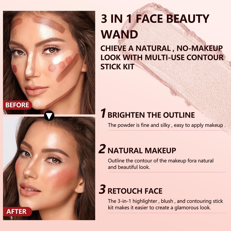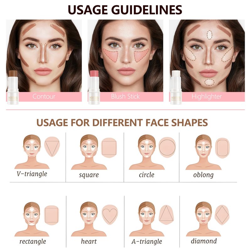 - ✨How To Use? The contouring makeup kit is designed for beginners. You can use the highlighter stick, Bronzer stick and blush stick to gently apply to your forehead, cheeks, jawline, nose and brow lines, dabbing softly with fingers, or you can stipple on color with brush, giving the skin a revived and youthful look.