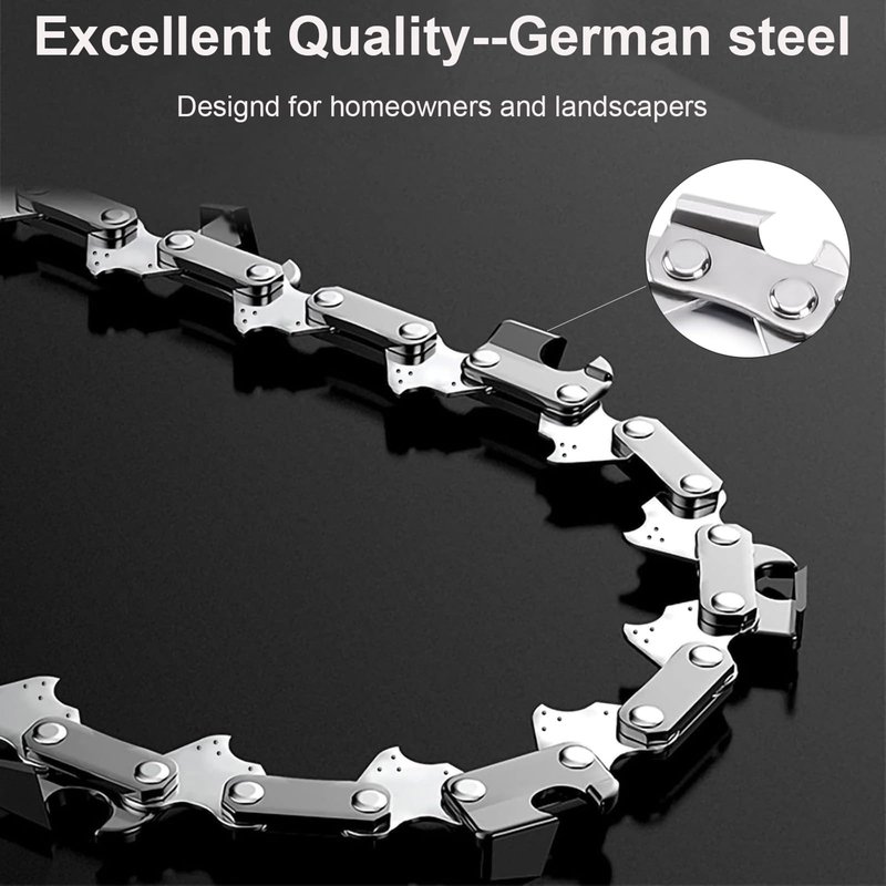 - Excellent Quality: German steel with precise heating control and punching systems enhances toughness and flatness. Hardened rivets improve wear resistance and strength, minimizing chain tension fluctuations. Japanese chrome-plated technology boosts cutter durability, with each cutter precision-ground and cold-headed for superior sharpness.