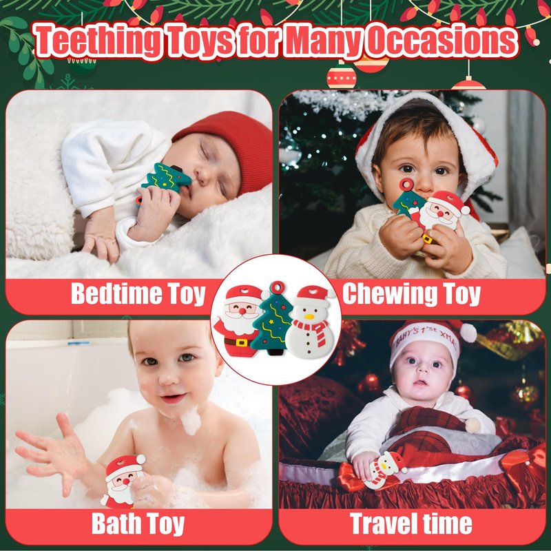 - CHRISTMAS TEETHING TOY SET: The Christmas Teether Toy Set contains 3 lovely Christmas themed silicone baby teethers designed with santa claus, snowman and Christmas Tree in mind. These Christmas teethers it can not only meet the baby's gum needs, but also help them expand their knowledge of new things and add a festive atmosphere, so it is loved by both baby boys and girls!
