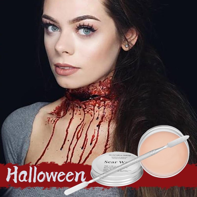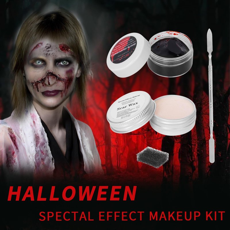 - Professional Halloween Makeup Set: Sfx makeup scar wax set includes 1 pack Scar wax,1 pack fake blood gel,1 pack spatula,1 pack stipple sponge and.Easy to shape to any realistic looks you can imagine.Scars and gashes,cuts,bullet holes,big wounds,bites,burns,blisters,fast lips,broken nose,bumps,torn face,prosthetics makeup,zombie makeup and any kinds of special effect sfx make up you want.The products are perfect for SFX make up.