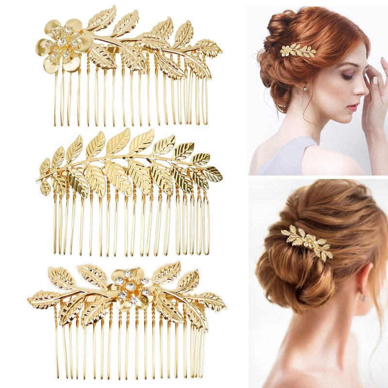 Romantic Goddess Hair Comb Set - Package includes 3 different golden hair side combs in leaves and flowers shape. Vintage palace styles hair comb set to make hair decoration different every day.