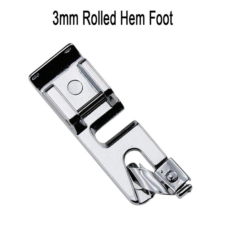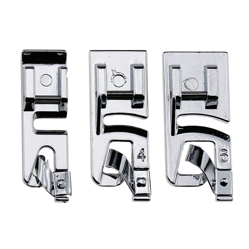 - 6mm, 4mm and 3mm rolled hem presser foot, Roll fabric edge and hem stitch at the same time