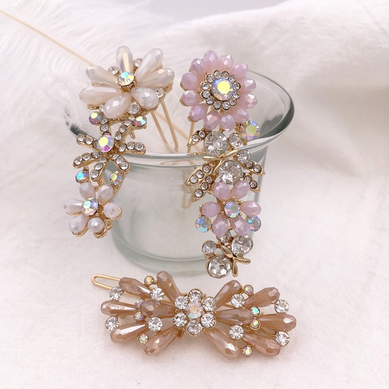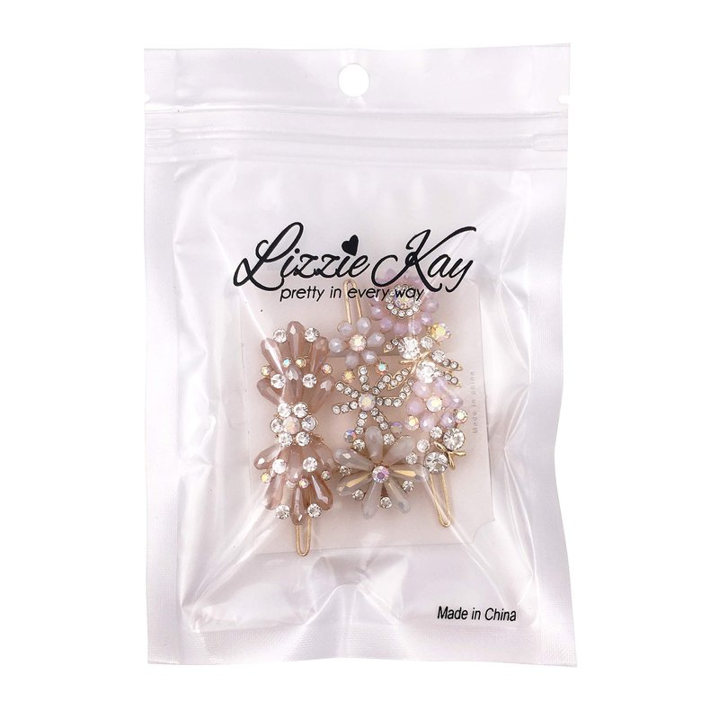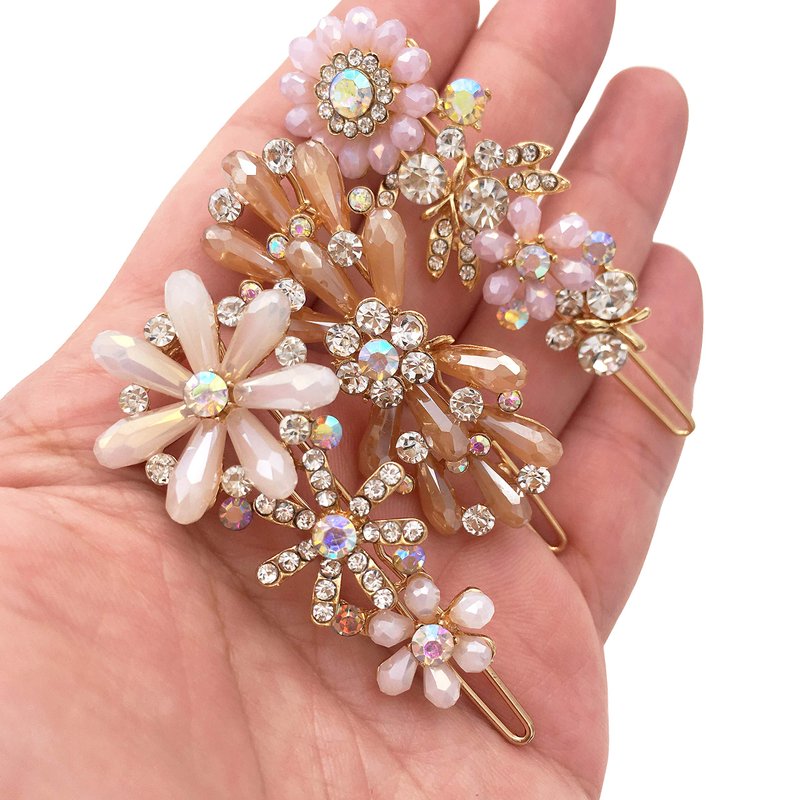 - CUTE ROMANTIC DESIGNS: This barrette set comes with three different designs in the sweet shades of off-white, pink, and champagne. Adorned with glistening crystals and beads, these petite clips add a chic shimmer to your style.