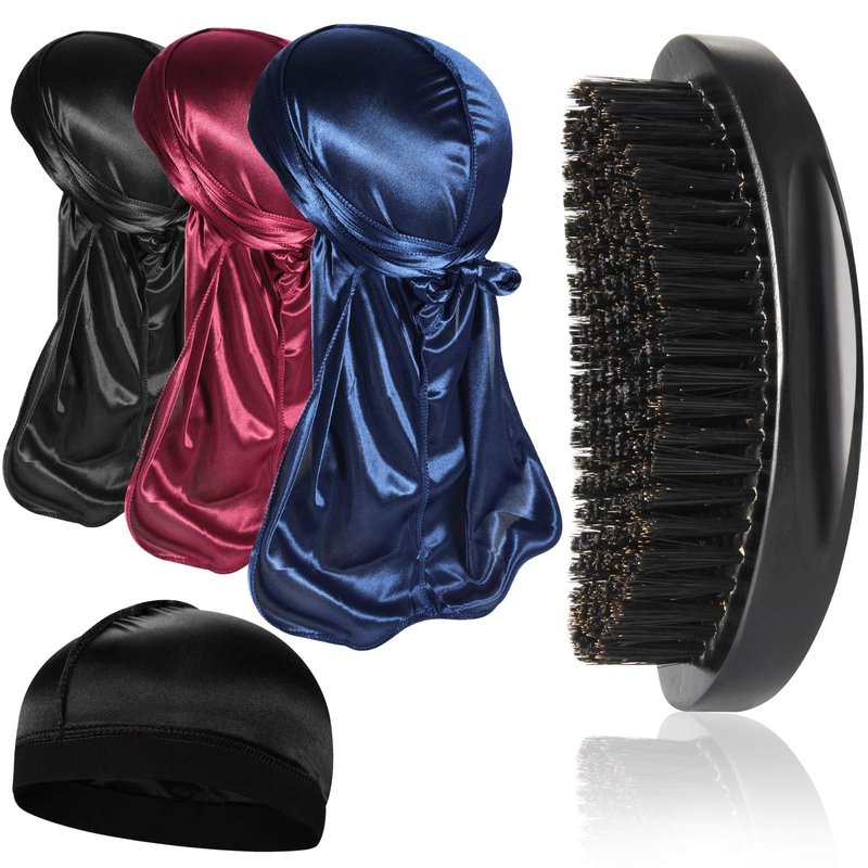 3pcs Silky Durag with Wave Brush for Men 360, Curved Medium/Hard Hair Brush Kits,C
