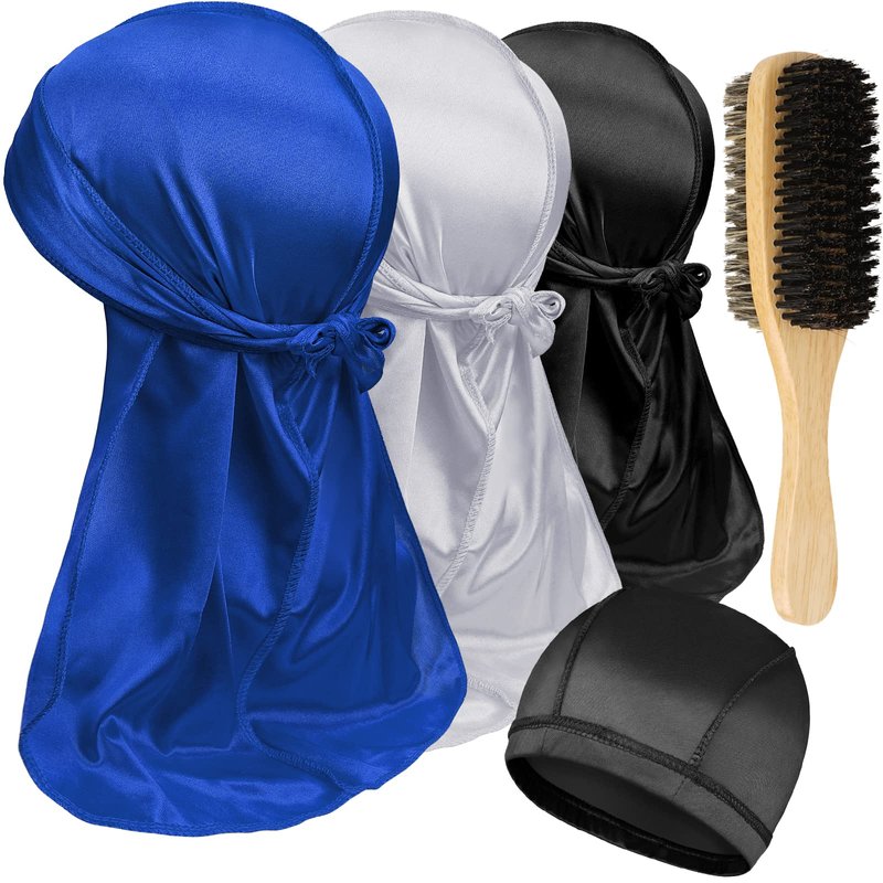 3PCS Silky Durags with Double Sided Brush for Men Wave, Satin Doo Rags for 360, 540, 720 Waves, Award 1 Wave Cap, Ideal Gifts for Christmas (blue+white+black)