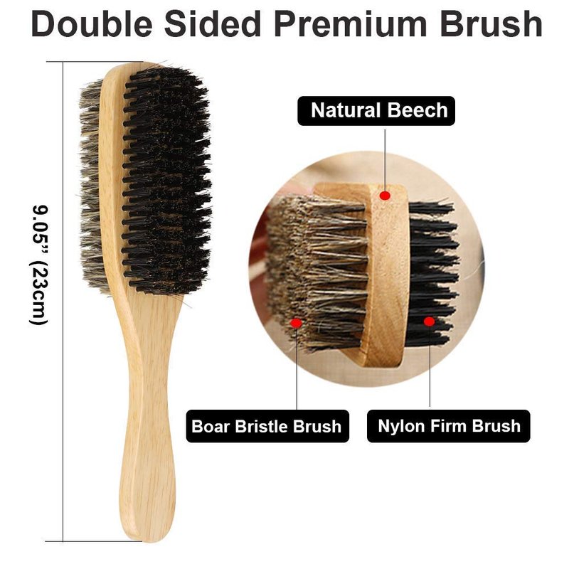 - 【DOUBLE SIDED BRUSH】This brush has one super stiff side, it's made from 100% firm boar bristles, it's great for getting deep into your hair and helping to straighten out any kinks or waves, while the other side is much softer and great for smoothing your hair. This brush is gentle on sensitive scalps and its advanced implantation technology reduces bristle loss. Great for smoothing and forming wave styles and helping spread the oils evenly throughout beard hair. Best for medium to coarse hair.