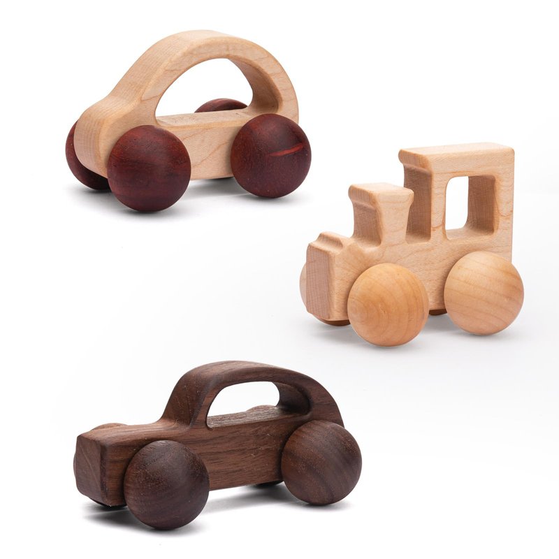- Wooden Toys Set - The baby toys set consists of three different types of wooden vehicles.
