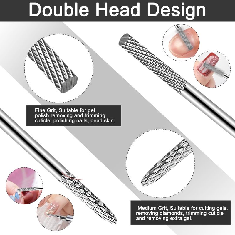 - High Quality & Made to Last: This nail drill bits set contains 1 x 3XF ultra fine safety cuticle nail drill bit and 1 x medium double heads acrylic gel nail bit, made of carbide, high strength and durability, little vibration. Made to last and save your money.