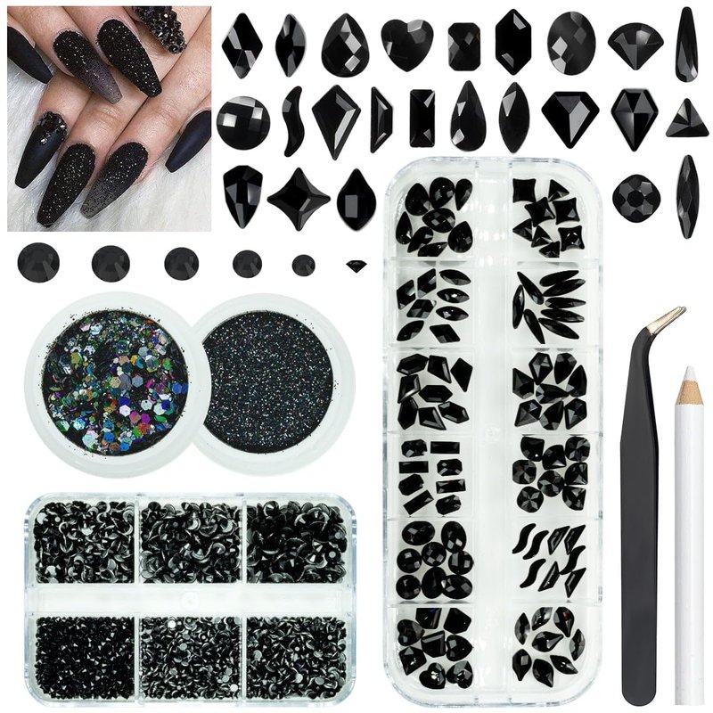 - ❤【4 Boxes Black Nail Rhinestones Fein Glitter Chunky Glitter +Stainless Steel Tweezer +Pickup Pen】1 Box 24 kinds of shapes sparkling Black rhinestones nail crystals, 1 Box multi-sized round crystal gem rhinestones, 1 Box Fein Glitter and 1 Box Chunky Glitter. Black flatback rhinestones can be easily used to natural and artificial nails. More options for your daily work decoration design. Comes with 1 Tweezer and Pickup Pen for Nail Supplies DIY Decoration.