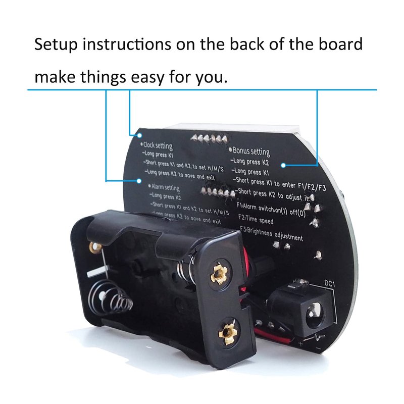 The soldering clock kit is easy to setup, two tact switches are enough, you could adjust hour/minute/second on the board easily.