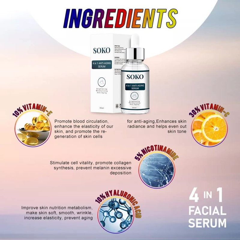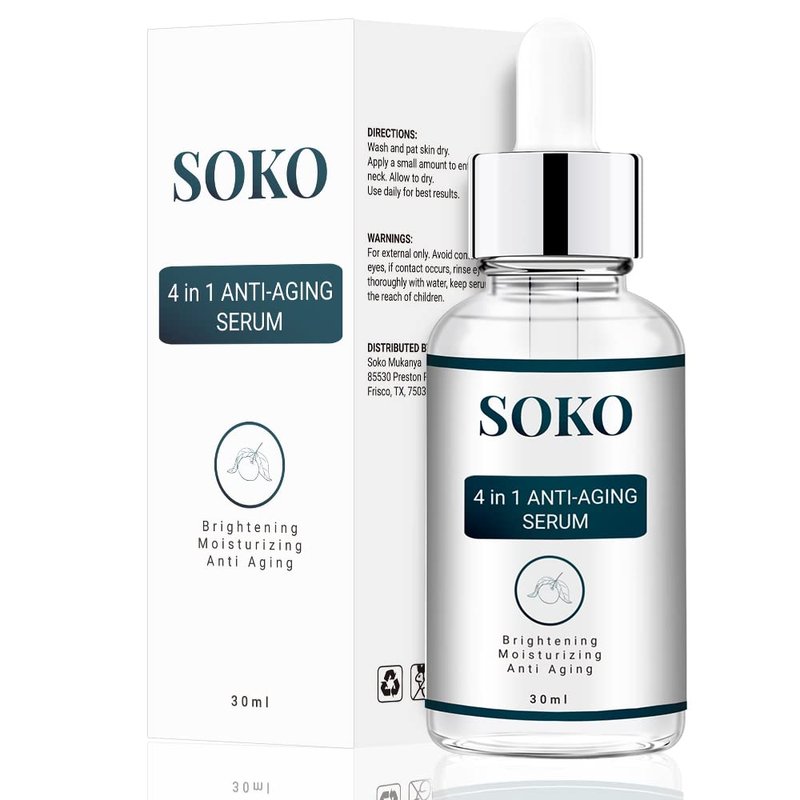 The Soko 4 in 1 Anti-aging serum is a powerful anti-aging serum that helps to stimulate collagen production, brighten the skin, and reduce the appearance of wrinkles. This serum contains Vitamin E, which helps to protect the skin from free radical damage, while Vitamin C helps to brighten the skin and reduce the appearance of wrinkles. Nicotinamide helps to reduce inflammation and redness, while Hyaluronic Acid helps to hydrate the skin and keep it looking young and healthy.