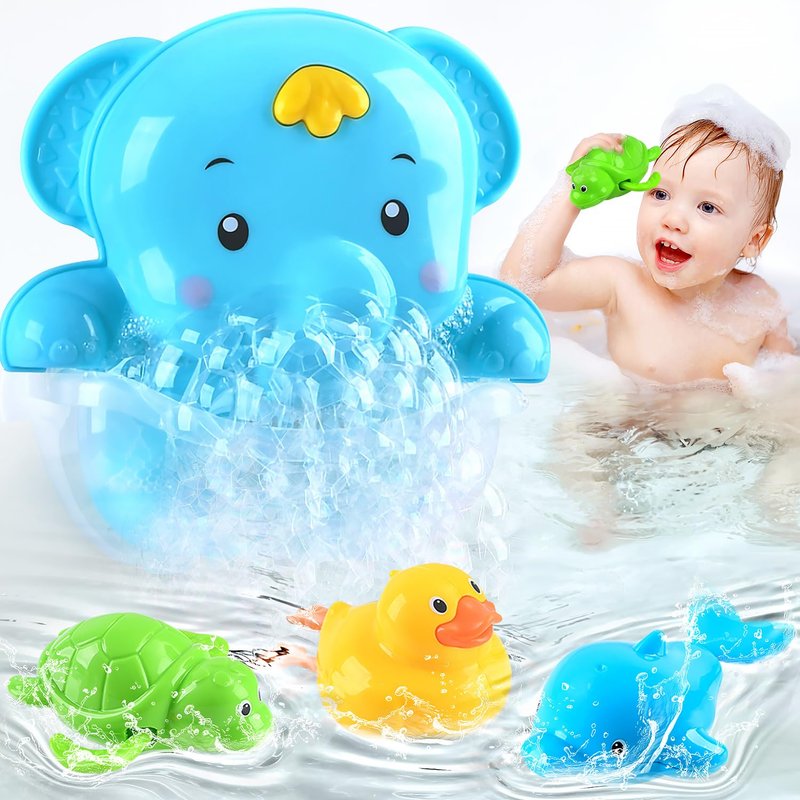 - 4 in 1 Bath Toys for Kids Ages 1-3: 1 pack elephant bath bubble machine and 3 pack floating wind up toys in exquisite gift box packaging. Vivid small animals swimming in the water to attract baby and create an enjoyable and funny experience for little one during bath time. Making bathing fun that baby no longer cries because of bathing.