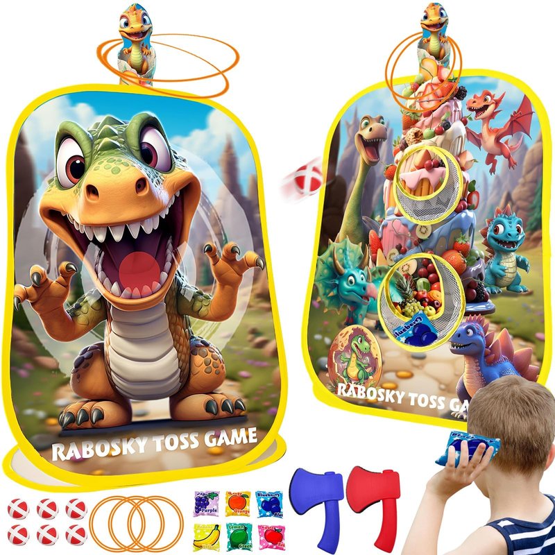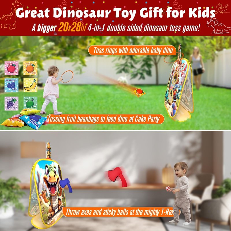 - 4-in-1 Bigger Double-Sided Toss Game: Enjoy bean bag toss, ring toss, axe throwing and sticky ball toss at dinosaurs in one 20 x 28in cornhole set. The upgraded design offers multiple entertainment for kids