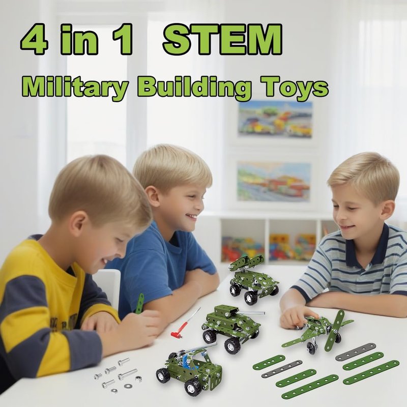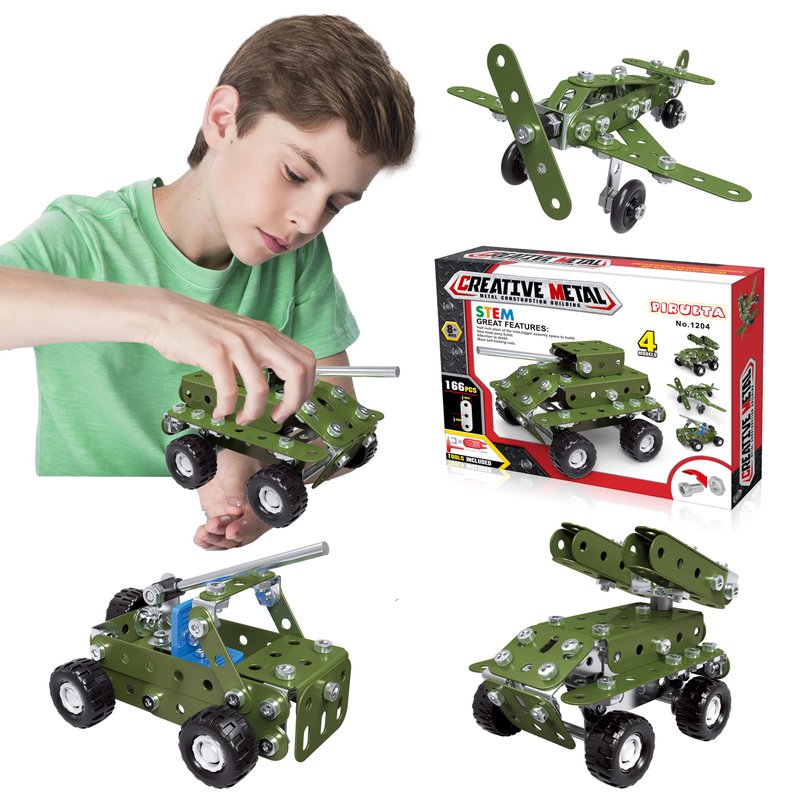 PIRUETA Metal Building Toys 4 in 1 Military Model Set For Kids Ages 8-16, Which Simulation Design And Clear Instructions Can Completely Keep Your Children Busy And Entertained For Hours! ► Realistic Detail Design Compared with the plastic version, we use metal material to make it more realistic and firm. ► With Wrench And Screwdriver & Clear Instructions We have equipped a wrench and a screwdriver to make it easier for children to assemble. In addition, you don’t have to worry about assembling toy that is too difficult for your children. We also have prepared clear instructions for the children and everything is clearly marked. Trust me, For children, assembling this building set will get a great sense of accomplishment.
