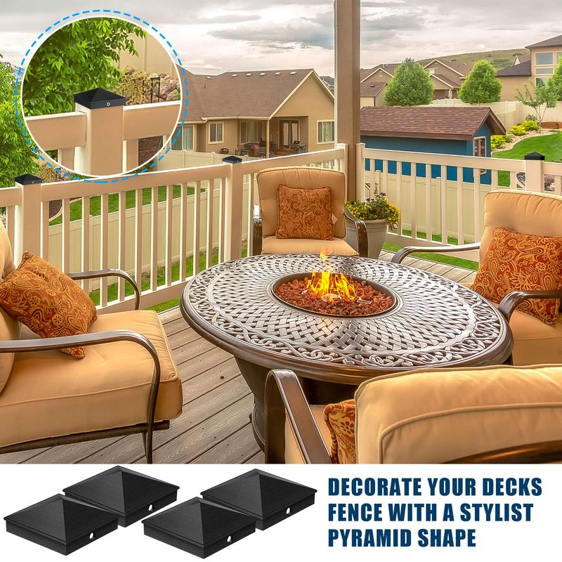 - Protect Posts: these aluminum wood post caps are applied to protect and decorate your fence posts; Install our post caps on top of the post to protect it from damage that can be caused by sun, ice, water and so on, and extend its life; These fence post toppers have a pyramid appearance, and the matte black casing can add a stylish touch to your yard