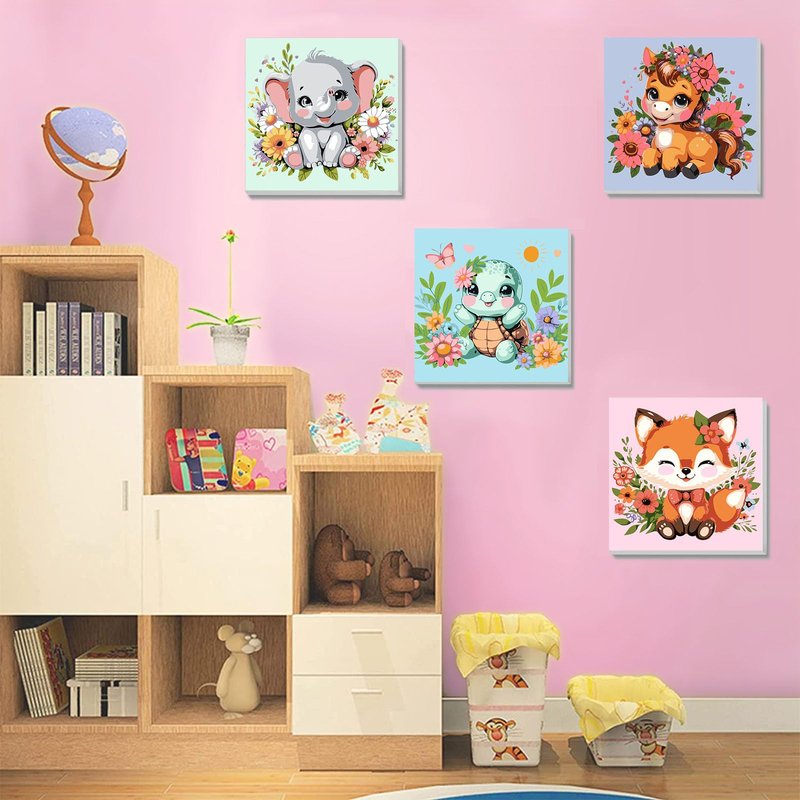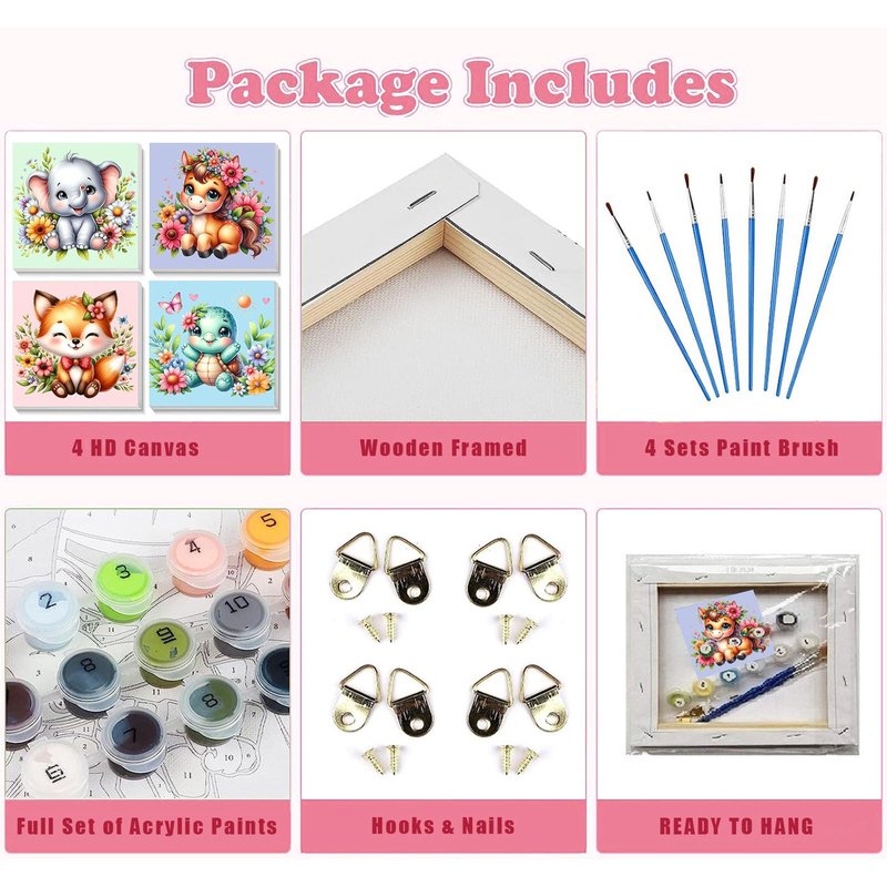 - 【What You Will Get】Looking for a way to bring out your child's creativity or a way to relieve stress?Look no further than our Paint by Number 4-Pack!Each kit comes complete with a beautifully framed canvas featuring cartoon pattern,high-quality paint,and two brushes with different tips to help create the perfect work of art.We even provide Hooks for hanging their masterpiece as stunning wall decor.Get ready to cherish their art forever!