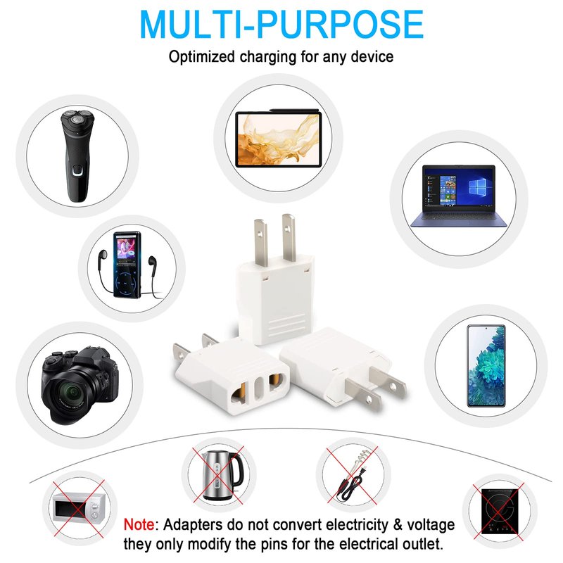 - 【MULTI-PURPOSE】: These plug converter europe to usa are very small electrical adapter plugs, perfect for charging Smart phones, Bluetooth speakers, cameras, tablets, shavers, headphones, laptops and so on. (Note: This is not a voltage converter; These plug adapter europe to us is only compatible for 110V to 250V wide voltage device)