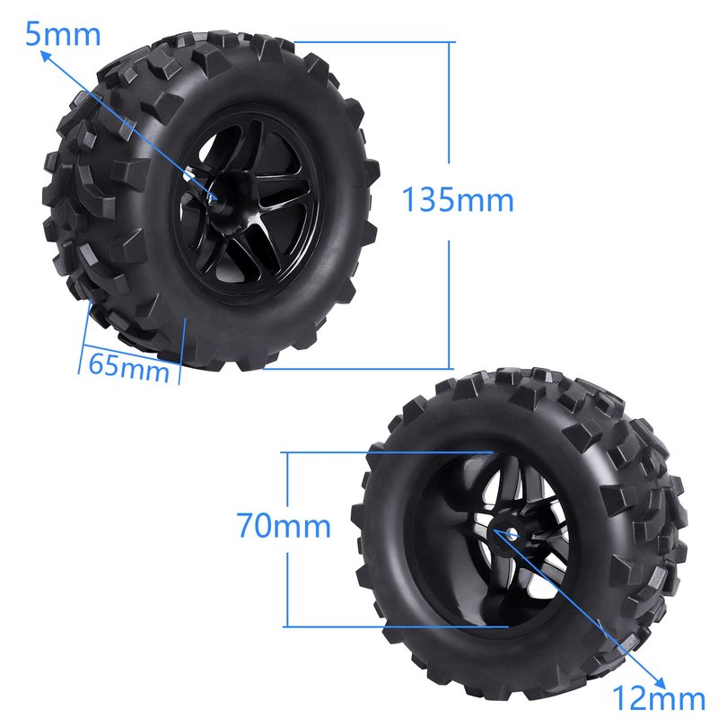 - Tires OD 5.31" (135mm); ID 2.75" (70mm);Width:2.55" (65mm)