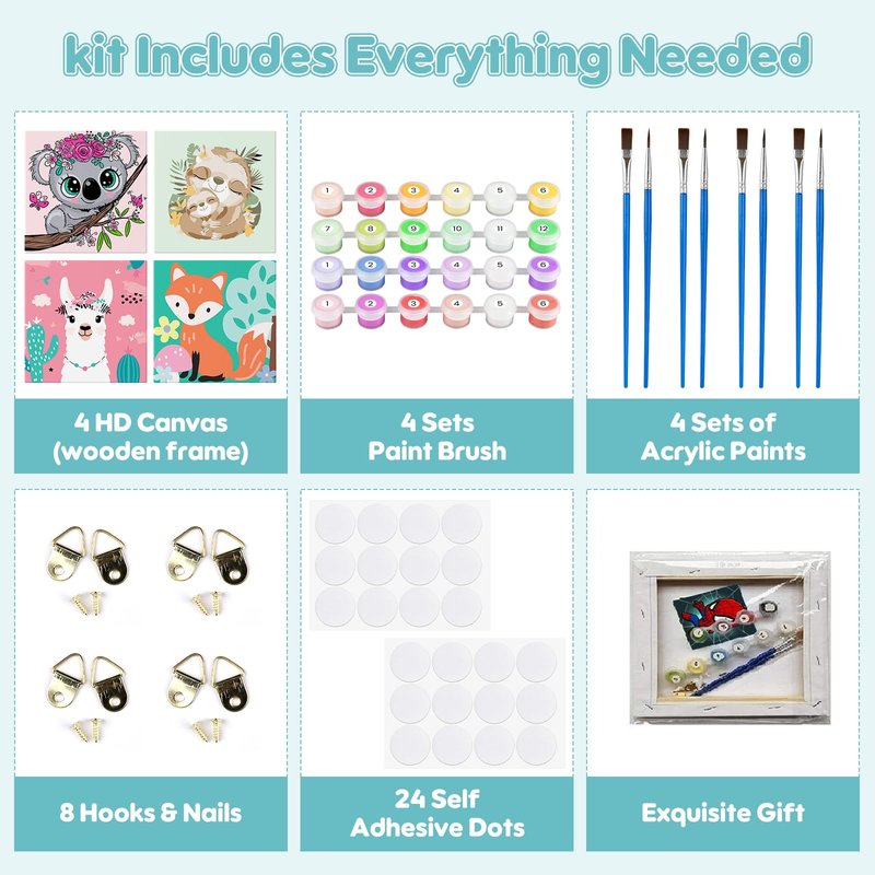 - What’s included: Everything you need is included in our kids' paint by numbers kits on canvas. Each set contains a beautiful framed canvas with cartoon designs, high quality paints and two brushes with different nibs. We also provide hooks and self adhesive dots to hang their masterpieces on the wall. Pictures by numbers kits can inspire creativity, look no further than our 4 pack paint by number