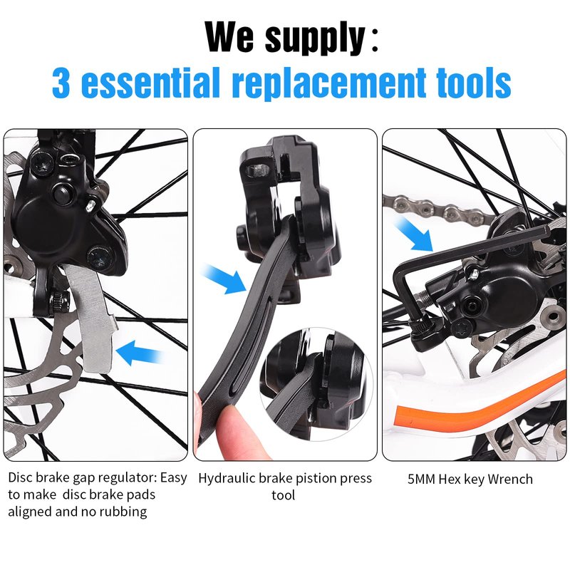 - We Provide 3 Essential Installation Tools: We know how inconvenient it is to buy replacement tools separately. Our package not only brings 4 pairs of bike brake pads, but also provides 1* disc brake gap regulator, 1* hydraulic brake pistion press tool and 1* hex wrench. If you buy these tools alone, you will spend twice or more.