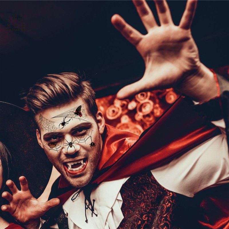 - 🕸️Makeup: The face eyeshadow sticker and Web Tattoo look vivid and natural, you can supplement with some makeup to make the final look more realistic and gruesome.