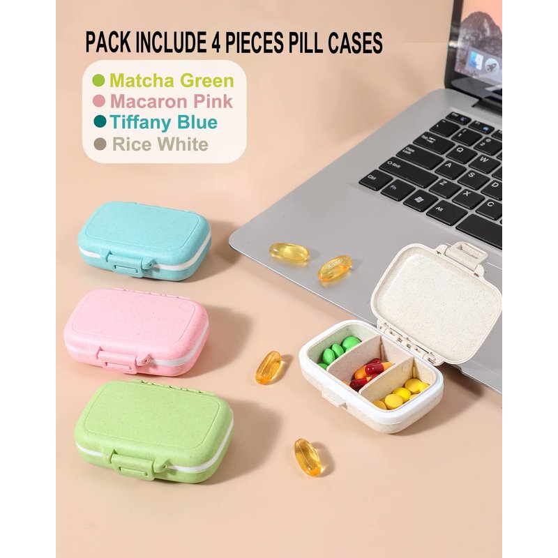- GOOD-QUALITY RAW MATERIALS-- Pill box made of the natural wheat stalk NO BPA,Package included: 4 * Pill case organizer (Khaki, green, pink, blue) + Label.