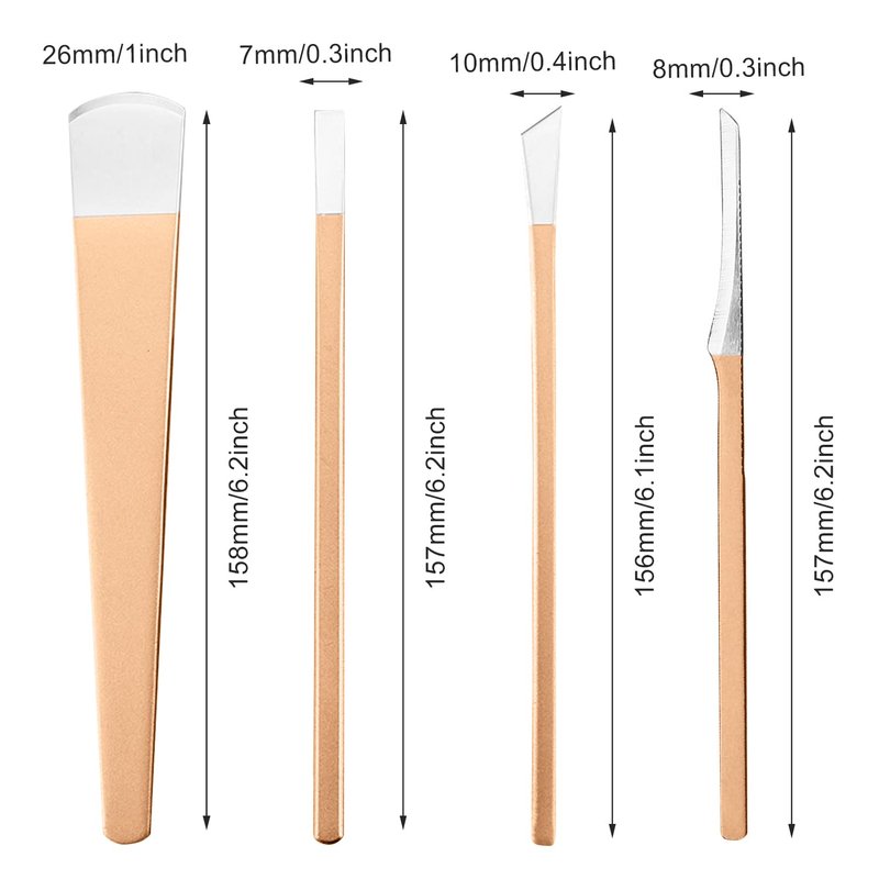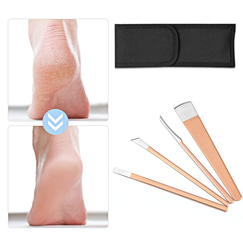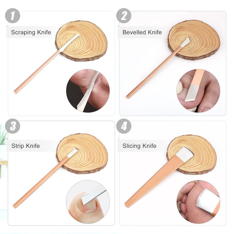 - 【Different Style】4 pieces knives, flat and slicing knives will trim calluses, corns, etc. Bevel knives remove residual nails at the base of toenails when treating ingrown nails. The scraper knives scrape dead skin and dirt between feet and toes.