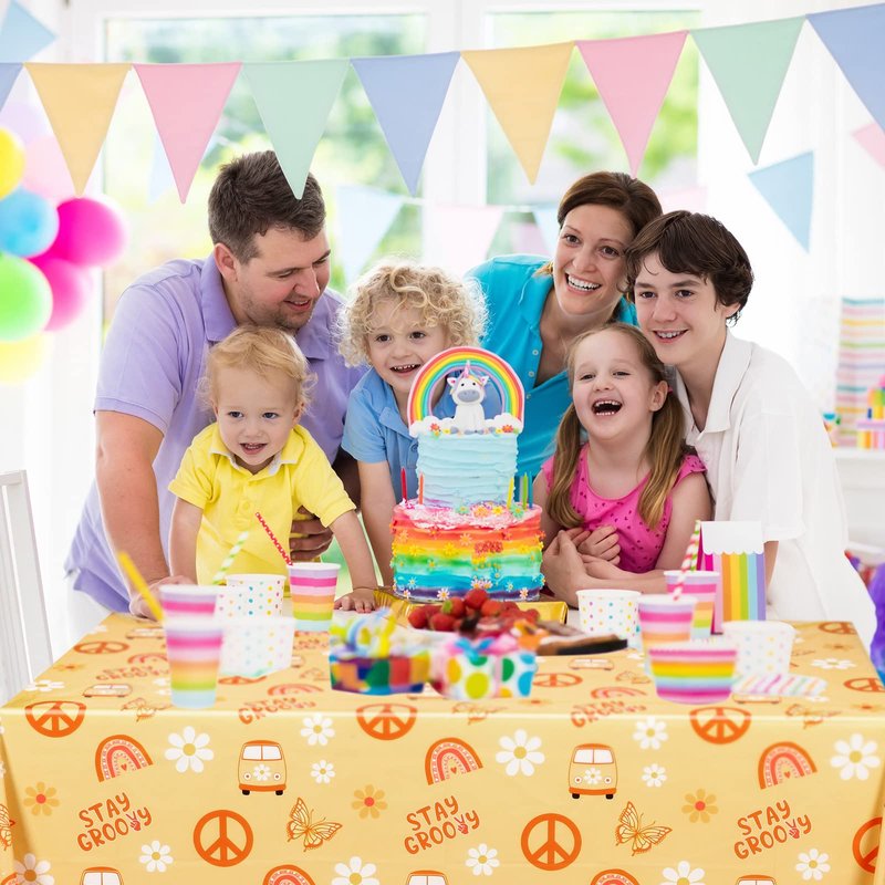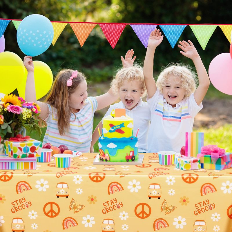- Hippie Boho Design: the groovy table cloths for parties are printed with novel boho patterns such as daisy flowers, victory signs, buses, butterflies, and the letters [stay groovy]; It's richly patterned, colorful and lively, can create a warm atmosphere for your party and leave everyone unforgettable memories
