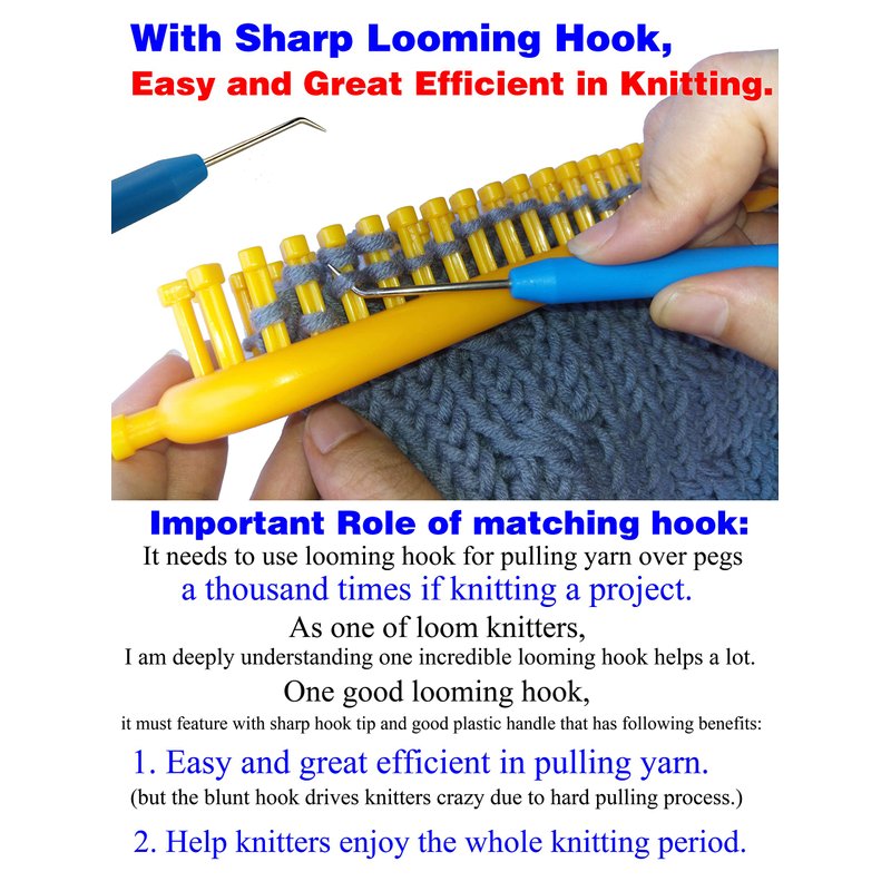 - As one of loom knitters, I am deeply understanding one incredible looming hook helps a lot. One good looming hook, sharp hook tip and good plastic handle Easy is great in pulling yarn, and help knitters enjoy the whole knitting period, not like the blunt hook drives knitters crazy due to hard pulling process.