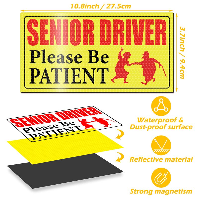 - Striking Magnet Sign: the senior driver magnet sign for car is crafted with bright lettering that nicely combined with a bright yellow background color which is so readable even a distance; And these colors are easier to notice to better inform other drivers; That old is driving, and this will reduce the impatience and honking from the back car and keep you safe
