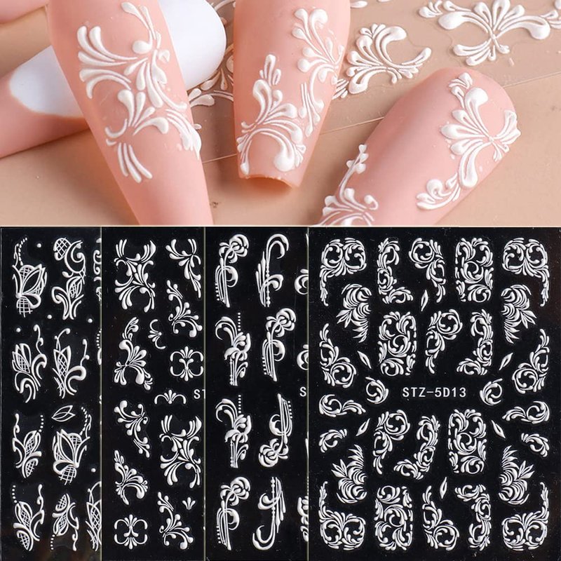 • 5D Embossed Nail Stickers: 4 sheets 2022 new design 5D self-adhesive white flowers nail art decals, will not fade naturally, with instructions, you will create a unique nail art through DIY.