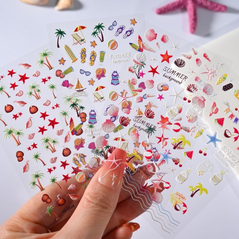 - 💕【What You Will Get】:You will get 4 sheets 5D relief nail art stickers with various patterns, anime, cartoon, flowers, stars, seashells, starfish, seagulls, glasses, bikini. 4 sheets of nail art stickers are available in rich summer patterns and decorative decals for various combinations of nail art.
