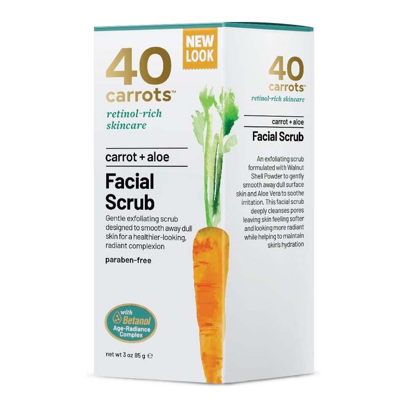 - 40 CARROTS FACIAL CLEANSING SCRUB: Retinol Rich cleansing facial scrub with carrot and aloe helps improve skin tone, texture, and clarity, for softer, brighter skin