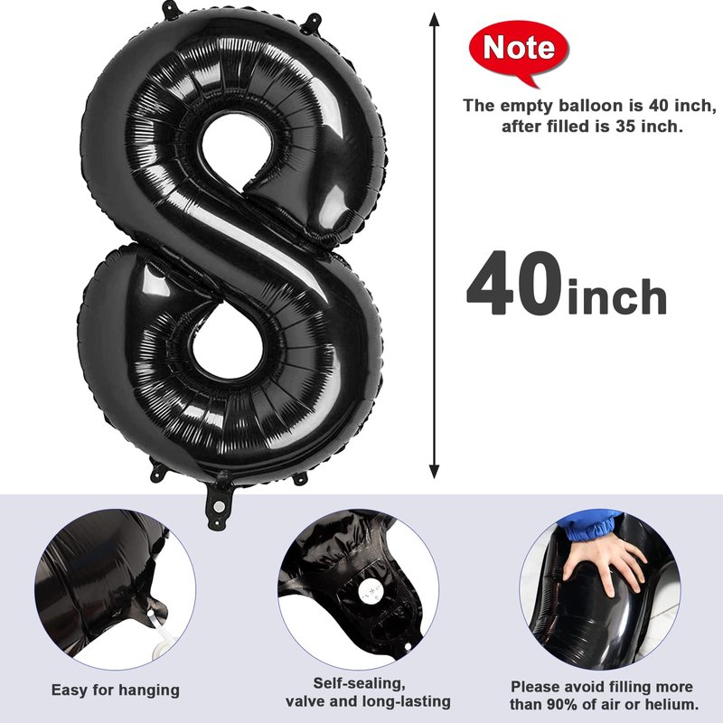 - 【GREAT PARTY DECORATIONS】 Looking for a unique number 8 balloon black for your kid or family? This large birthday balloon is a perfect add-on to a cool black birthday party set-up, add a great impact to your girl boy birthday decoration, fits for 8th birthday decorations for girls boys, 18th black balloons, 28, 38, 48, 58, 80, 88 years birthday balloons for birthdays or anniversaries.