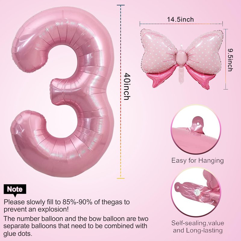 - Package includes: 1pcs 40inch candy pink number balloon, 1pcs mini bow balloon, 1pcs straw, 1 sheet glue dots. (Used to connect crown balloons and digital balloons; you can also stick balloons anywhere you want to decorate.)