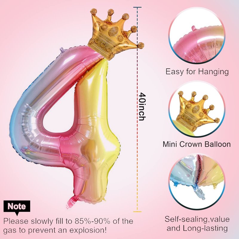 40 Inch Rainbow Gradient Number 4 and Mini Crown Balloon for 4th Birthday Party Decorations, Girl Birthday Party Balloons Decorations,Anniversary Decorations Supplies