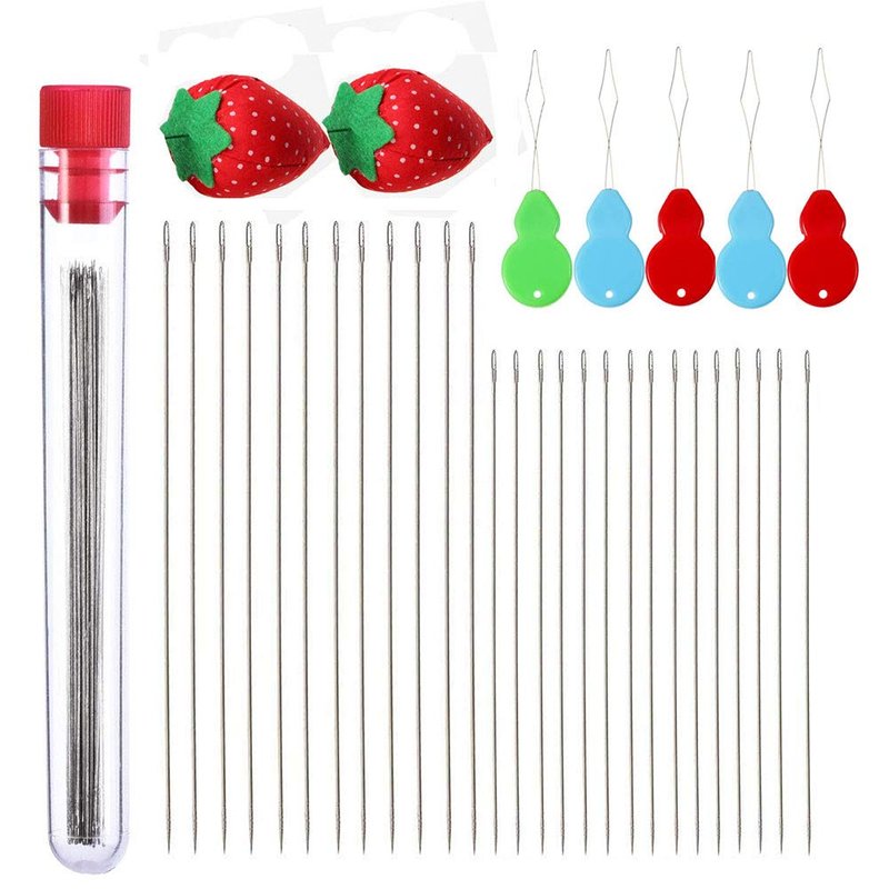- Package: 20 Pieces 80mm/3.15 inch long beading needles, 20 pieces 55mm/2.16 inch long straight bead thread needles, 5 Pieces Gourd-shaped beading Needle Threaders(Assorted colors ) and 2 pieces strawberry shape Sewing Needles Holder Pin Cushion