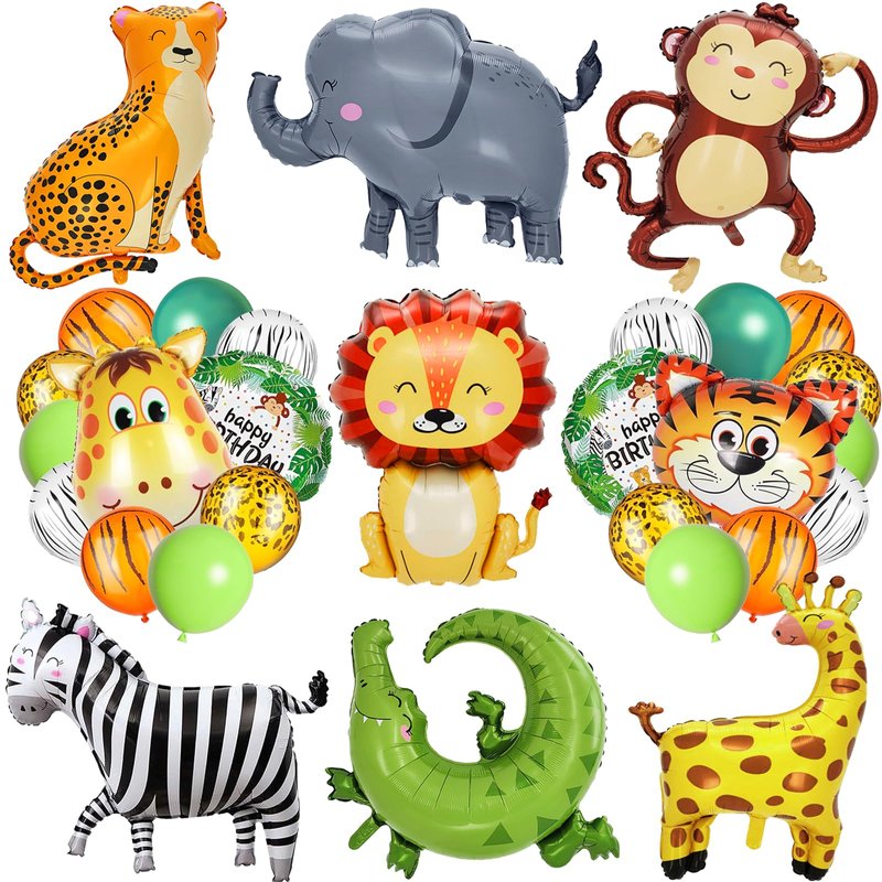 - 🙉[All in One Safari Birthday Decorations Sets]: safari baby shower decorations set contains many different jungle animals, which are very real and cute. Package Included 10pcs giant safari animal foil balloons(tiger,elephant,monkey,lion,giraffe,leopard,zebra,crocodile and 2pcs round happy birthday balloons) and 30pcs latex jungle animal balloons.