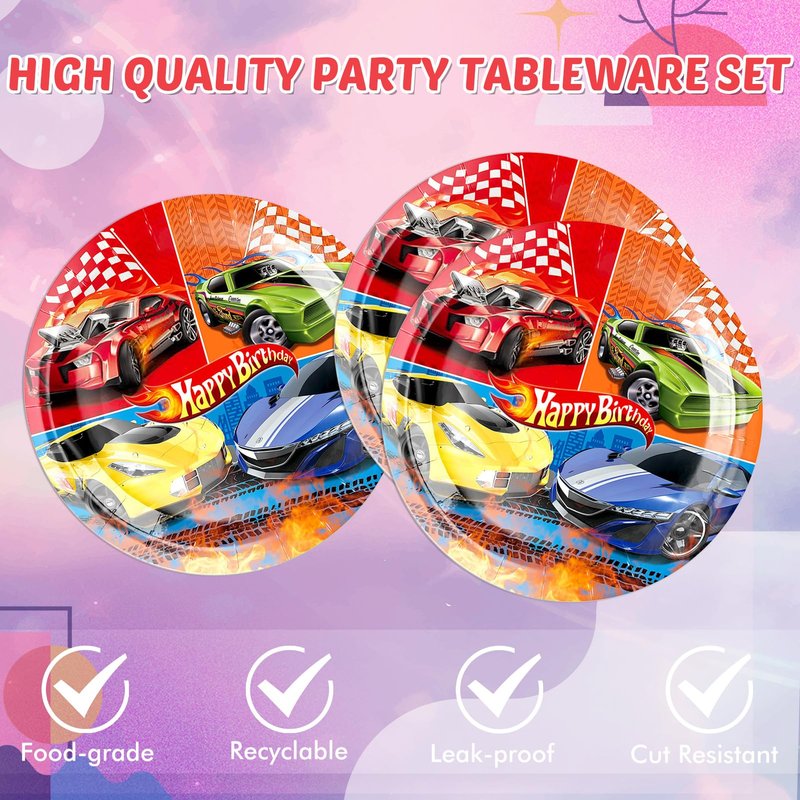 - šćEco-Friendly&High-Quality Party Tablewareć Make your party shine with racing car party plates and napkins!Our plates, napkins are made from high-quality, sturdy paper ļ¼environmentally friendly, non-toxic, odor-free, beautifully printed in patterns and colors, not easy to fade, the napkins are soft and non-smell.so you can use them with confidence.